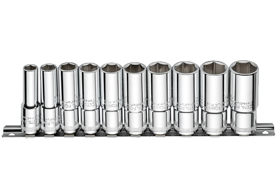 Ceta Form Sockets are very high quality, using a compact design, precision fit to nuts and bolts with knurls to aid non-slip gripping and a female square for perfect fit to ratcheting handle. 10 Piece 3/8" Drive 6-Point Deep Socket Set are manufactured from high quality steel and meet all standards and tolerances.