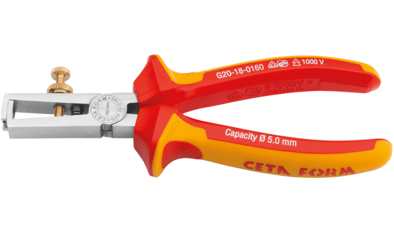 Ceta Form 160 mm 1000V Wire Stripping Pliers (VDE). Chrome plated with soft-grip handles. EN 60900, VDE 0682 Teil 201. For stripping of single / multi-strand conductors’ plastic insulations.