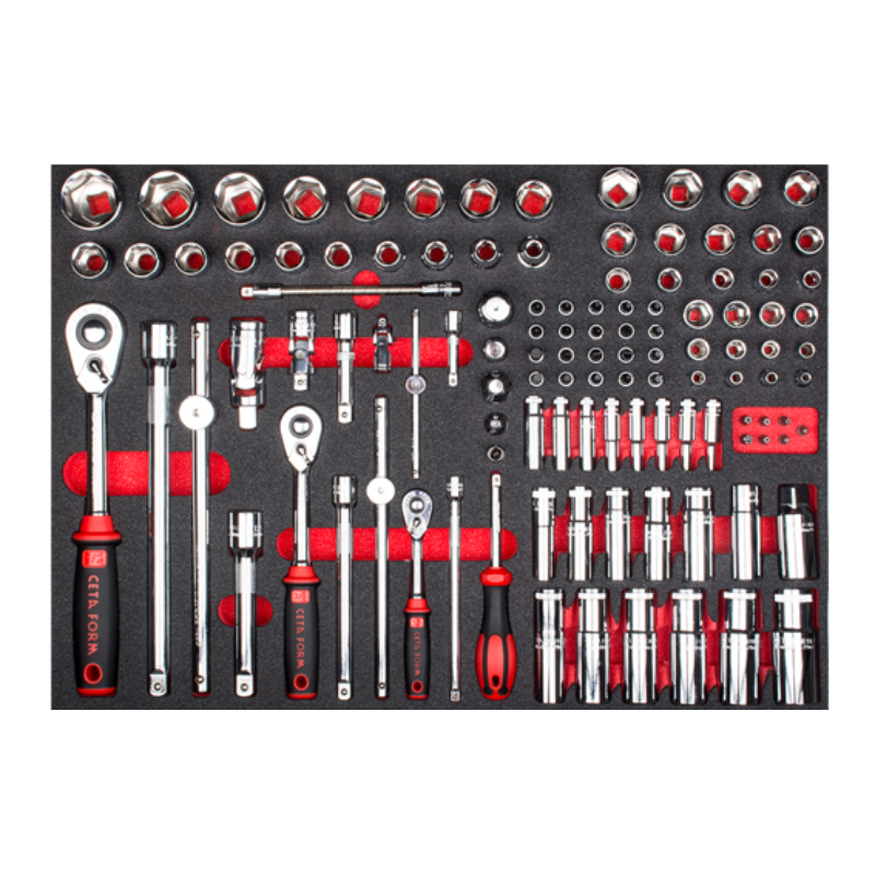 Ceta Form Tool Modules offer traceability and efficiency at its best. The 115 Piece 1/4″+3/8″+ 1/2″ Drive 6-Point Socket Set (in EVA) is the ultimate socket set with all 3 key drive sizes represented.