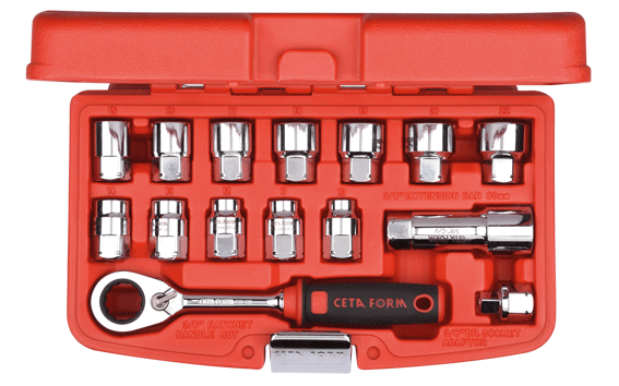 Ceta Form Socket Sets are offered in a HDPE molded case to withstand knocks, drops and variations in temperature. 15 Piece Multi-Fix Hollow Socket Set comprise the most popular and useful sizes of sockets with a ratchet and all the necessary accessories.