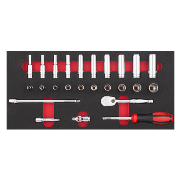 Ceta Form Tool Modules offer traceability and efficiency at its best. The 25 Piece 1/4” Drive 12-Point Socket Set (in EVA) is a useful addition to any tool kit, featuring key sizes of 1/4″ sockets, a ratchet and accessories, in imperial sizing.
