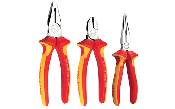 Ceta Form 3 Piece 1000V Pliers Set (VDE). Chrome plated with soft-grip handles. Combination pliers, diagonal cutters and long nose pliers in a boxed set.