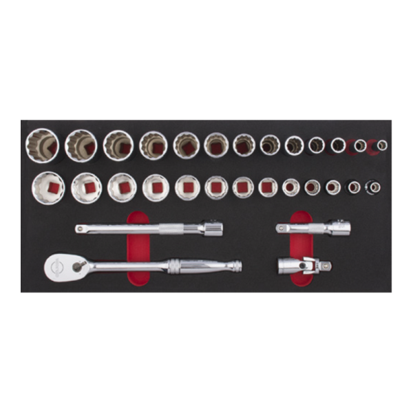 Ceta Form Tool Modules offer traceability and efficiency at its best. The 30 Piece 3/8” Drive 12-Point Socket Set – SAE (in EVA) is a useful addition to any tool kit, featuring key sizes of 3/8″ sockets, a ratchet and accessories, in imperial sizing.