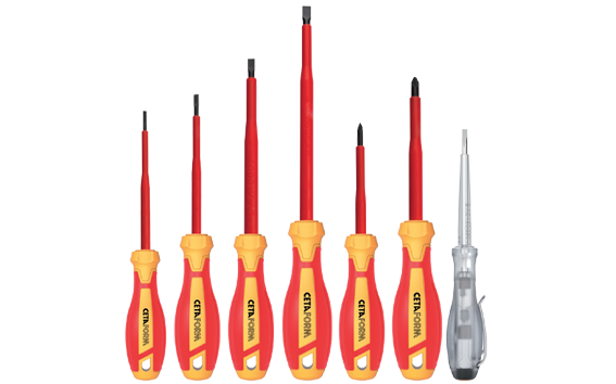 Ceta Form manufacture a broad range of 1000v insulated electrical tools including screwdrivers. C-Plus VDE screwdrivers feature precision machined fit non-peel black finish tip, dielectric Dielectric tested blade insulation directly molded onto the blade thus safeguarding against electricity. Refined ergonomic design and premium quality plastic materials for a comfortable grip. 2K Handle technology for high torque transmission with less stress. Every tool is individually tested in a water bath at 10.000 Volts according to DIN EN 60900, IEC 900 norms. Ceta Form 7 Piece C-PLUS 1000V Screwdriver Set (VDE) – Slotted/Pozdriv + Tester. For safe working on live electrical applications up to 1000v AC and 1500v DC. Supplied in a printed card box.