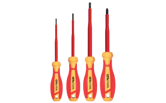 Ceta Form manufacture a broad range of 1000v insulated electrical tools including screwdrivers. C-Plus VDE screwdrivers feature precision machined fit non-peel black finish tip, dielectric Dielectric tested blade insulation directly molded onto the blade thus safeguarding against electricity. Refined ergonomic design and premium quality plastic materials for a comfortable grip. 2K Handle technology for high torque transmission with less stress. Every tool is individually tested in a water bath at 10.000 Volts according to DIN EN 60900, IEC 900 norms. Ceta Form 4 Piece C-PLUS 1000V Screwdriver Set (VDE) -Slotted/Pozidriv. For safe working on live electrical applications up to 1000v AC and 1500v DC. Supplied in a printed card box.