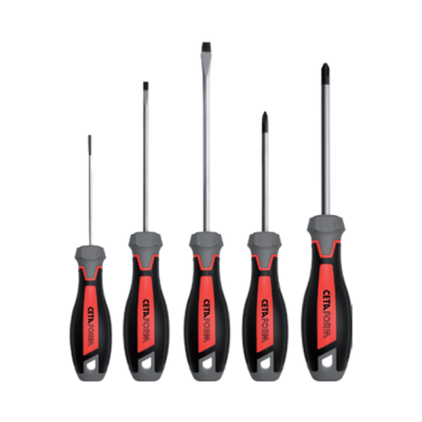 Ceta Form C-Plus Screwdriver Sets in a Completely New Design! Better in every detail. Our popular C-Plus screwdriver range has undergone a major redesign process. The new handle design offers even better handling ergonomics compared to the previous version. Moreover the new 3K molding technology used in the production of these screwdrivers enable us achieve an even higher molding quality hence better haptics. Available in 4 different variants two of which are new. 5 Piece C-PLUS Screwdriver Sets have precision machined tips with an XL handle to enable increaed torque combined with a slim handle section for turning with speed.