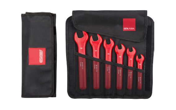 Ceta Form 1000v Open End Wrench Set (VDE) in Roll Pouch. Featuring injection molded 2-layer plastic for safety. Handy set of 6 key sizes in a roll pounch.
