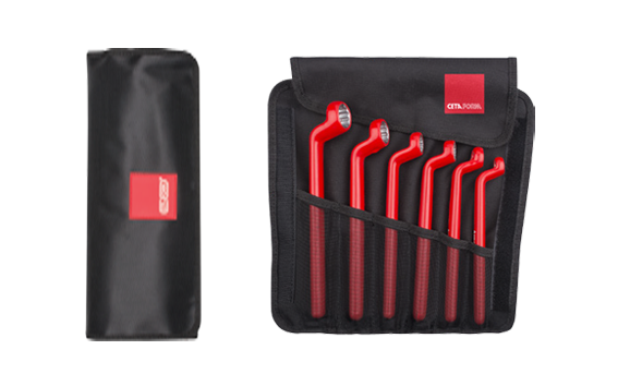 Ceta Form 1000v Ring End Wrench Set (VDE) in Roll Pouch. Featuring injection molded 2-layer plastic for safety. Handy set of 6 key sizes in a roll pounch.