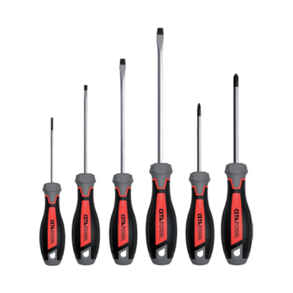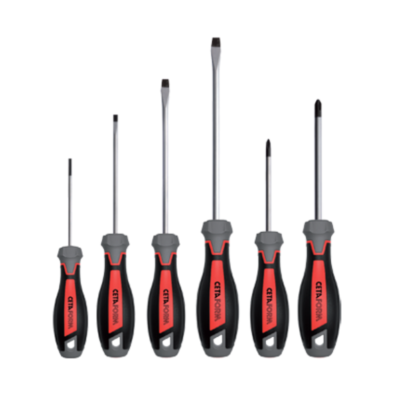 Ceta Form C-Plus Screwdriver Sets in a Completely New Design! Better in every detail. Our popular C-Plus screwdriver range has undergone a major redesign process. The new handle design offers even better handling ergonomics compared to the previous version. Moreover the new 3K molding technology used in the production of these screwdrivers enable us achieve an even higher molding quality hence better haptics. Available in 4 different variants two of which are new. 6 Piece C-PLUS Screwdriver Sets have precision machined tips with an XL handle to enable increaed torque combined with a slim handle section for turning with speed.