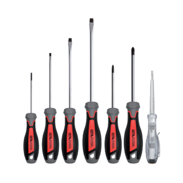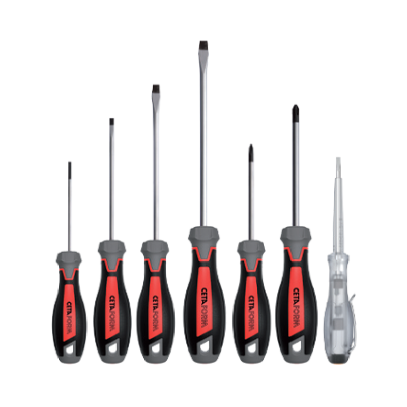 Ceta Form C-Plus Screwdriver Sets in a Completely New Design! Better in every detail. Our popular C-Plus screwdriver range has undergone a major redesign process. The new handle design offers even better handling ergonomics compared to the previous version. Moreover the new 3K molding technology used in the production of these screwdrivers enable us achieve an even higher molding quality hence better haptics. Available in 4 different variants two of which are new. 7 Piece C-PLUS Screwdriver Sets (with VDE Tester) have precision machined tips with an XL handle to enable increaed torque combined with a slim handle section for turning with speed.
