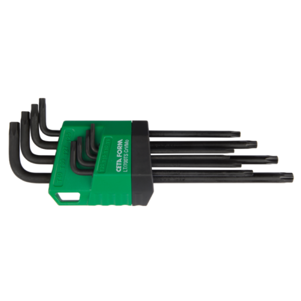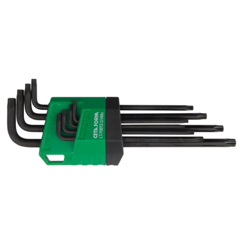 Ceta Form Hex and TORX L Keys. A comprehenisve range of hex and TORX L keys in industrial quality to suit every application. Colour coded clips for ease of selection. 8 Piece TORX IPR L Key Set (Long Arm) are manufactured from high quality steel and meet all standards and tolerances.