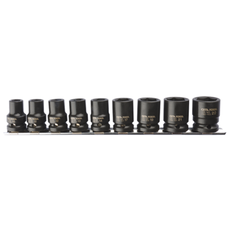 Ceta Form Impact sockets are manufactured from Chrome-Vanadium-Molybdenum steel in a thicker wall profile. Therefore, they are fit for use with high torque air tools. 9 Piece 1/2″ Drive 6-Point Impact Socket Set are available in key sizes.