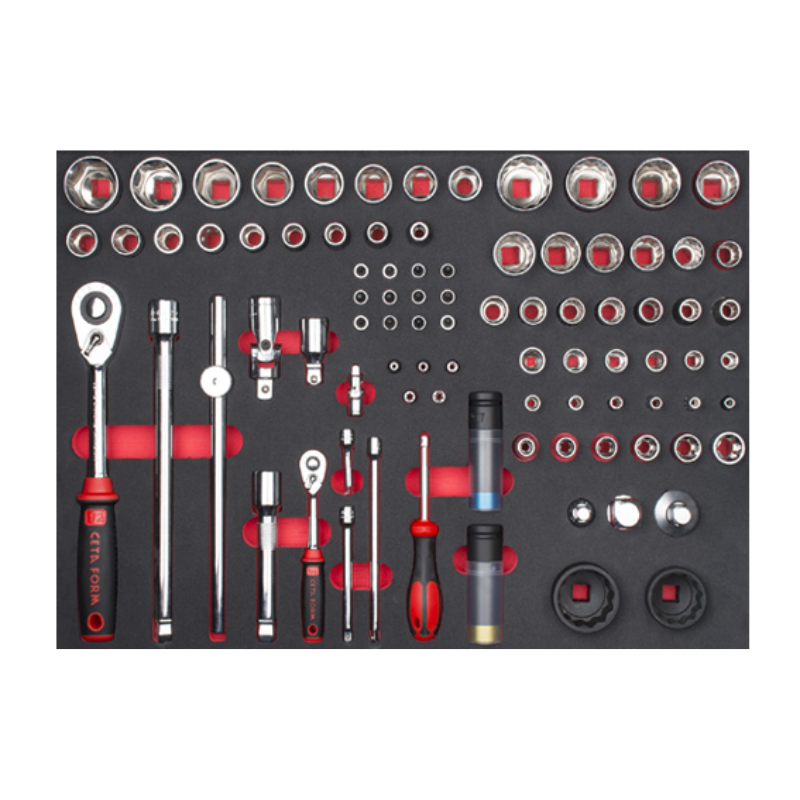 Ceta Form Tool Modules offer traceability and efficiency at its best. The 95 Piece 1/4"+ 1/2" Drive Socket Set (in EVA) offers ratchets, an extensive range of sockets and accessories.
