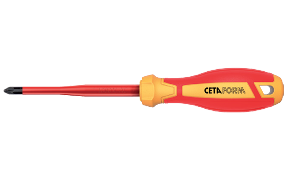 Ceta Form manufacture a broad range of 1000v insulated electrical tools including screwdrivers. C-Plus VDE screwdrivers feature precision machined fit non-peel black finish tip, dielectric Dielectric tested blade insulation directly molded onto the blade thus safeguarding against electricity. Refined ergonomic design and premium quality plastic materials for a comfortable grip. 2K Handle technology for high torque transmission with less stress. Every tool is individually tested in a water bath at 10.000 Volts according to DIN EN 60900, IEC 900 norms. Ceta Form C-Plus Soft-Grip 1000v Pozi S;limline Screwdrivers (VDE). Slimline design with insulation tapered to the diameter of the time. Unlimited access in critical working areas. For safe working on live electrical applications up to 1000v AC and 1500v DC. EN 60900, VDE 0682 Teil 201, DIN ISO 8764