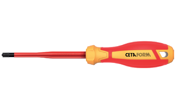 Ceta Form manufacture a broad range of 1000v insulated electrical tools including screwdrivers. C-Plus VDE screwdrivers feature precision machined fit non-peel black finish tip, dielectric Dielectric tested blade insulation directly molded onto the blade thus safeguarding against electricity. Refined ergonomic design and premium quality plastic materials for a comfortable grip. 2K Handle technology for high torque transmission with less stress. Every tool is individually tested in a water bath at 10.000 Volts according to DIN EN 60900, IEC 900 norms. Ceta Form C-PLUS 1000V PZ/SL Screwdriver (VDE-Slimline) – #2×100 mm. Slimline design with insulation tapered to the diameter of the time. Unlimited access in critical working areas. For safe working on live electrical applications up to 1000v AC and 1500v DC. EN 60900, VDE 0682 Teil 201, DIN ISO 8764. For terminal screws (Pozidriv/Slotted).