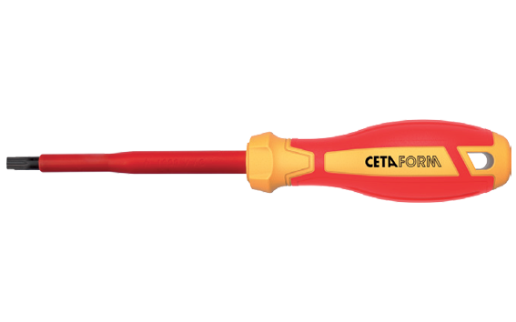 Ceta Form manufacture a broad range of 1000v insulated electrical tools including screwdrivers. C-Plus VDE screwdrivers feature precision machined fit non-peel black finish tip, dielectric Dielectric tested blade insulation directly molded onto the blade thus safeguarding against electricity. Refined ergonomic design and premium quality plastic materials for a comfortable grip. 2K Handle technology for high torque transmission with less stress. Every tool is individually tested in a water bath at 10.000 Volts according to DIN EN 60900, IEC 900 norms. Ceta Form C-Plus Soft-Grip 1000v TORX Screwdrivers (VDE). For safe working on live electrical applications up to 1000v AC and 1500v DC. EN 60900, VDE 0682 Teil 201