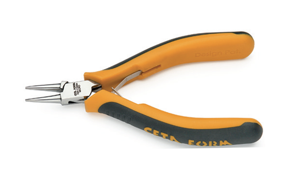 Ceta Form C-TRONIC Electronics Round Nose Pliers- 130 mm. Hot drop forged, hardened and tempered steel. Induction hardened, precision milled cutting edges, replaceable sheet steel springs, ergonic 2k handle. For forming wire loops, box-joint design.