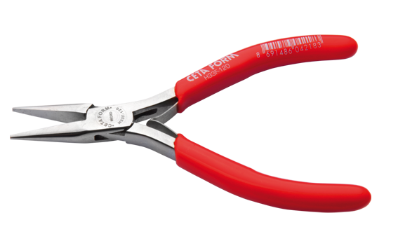 Ceta Form C-TRONIC Electronics Short Needle Nose Pliers (Flat Gripping Surface) - 120 mm. Box joint construction. Hot drop forged, hardened and tempered quality stainless steel. Induction hardened, precision milled cutting edges. Welded sheet steel spring mechanism, dipped handle. Flat gripping jaws, box-joint design