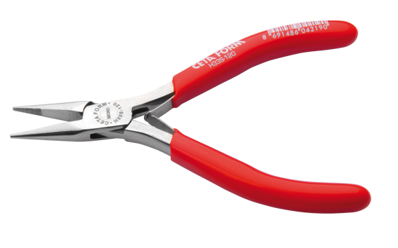 Ceta Form C-TRONIC Electronics Short Needle Nose Pliers (Toothed Gripping Surface) - 120 mm. Box joint construction. Hot drop forged, hardened and tempered quality stainless steel. Induction hardened, precision milled cutting edges. Welded sheet steel spring mechanism, dipped handle. Serrated gripping jaws, box-joint design